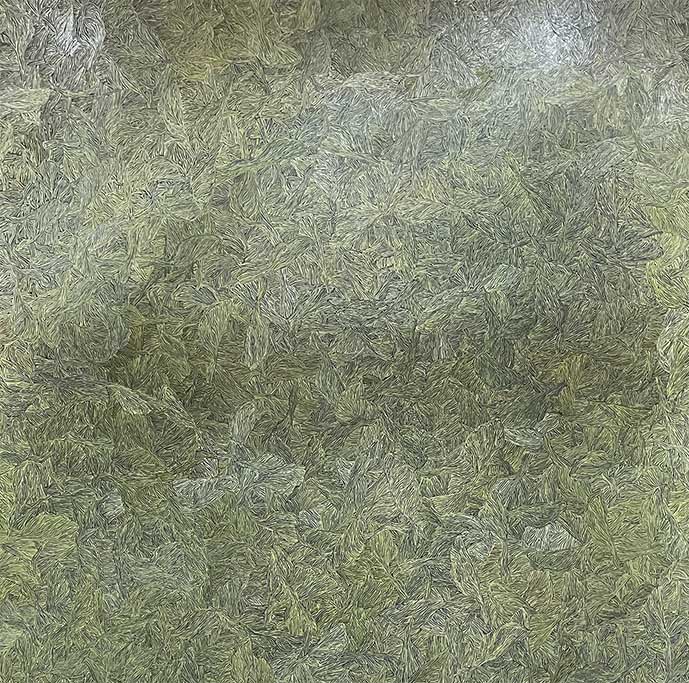 平林千明は1987年生まれの画家で、多摩美術大学で油画を専攻しました。主に植物をモチーフに、油彩による作品を制作しています。植物の茎に付く葉の規則性を表す「葉序」をテーマに、自然の規則性と自身の感性を融合させ、柔らかく不定形な表現を追求しています。心臓の鼓動のように自然に、かつ波のように繰り返しつつも不思議に安定した、中庸の美とも言うべき独自の世界を希求する作風が特徴です。