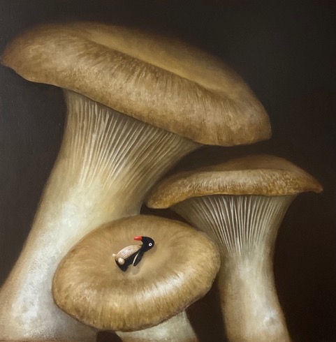 中村文俊の作品の細部まで描き込まれた風景には、それとしては普遍的であるのにも関わらず、どこか不安を喚起する事象、明らかに不穏な出来事、しかしまた、普通とも思える光景が交錯し、一つの画面の中で日常のあらゆる事象が多重奏を奏でています。それが不協和音に終始しないのは、中村文俊の卓越した画力と、ペンギンに象徴されるユーモアを交えた表現によるものと思われます。筆致がたどれないほど緻密に描きこまれた、中村文俊の沁みわたる絵画世界をおたのしみください。